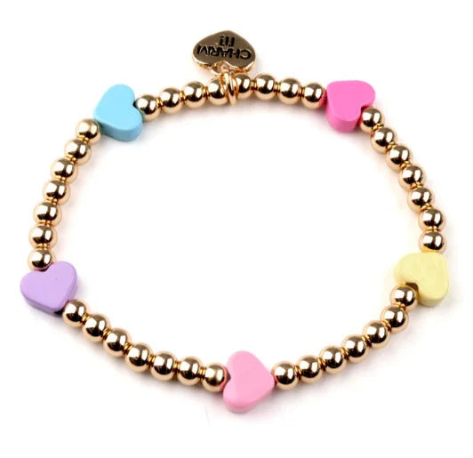 1 Pulseira Dourada Stretch Coração Pastel: A base mais doce do nosso estojo! Composta por bolinhas douradas e corações em tons pastel, ela é elástica, super confortável para escrever e desenhar, e traz aquela leveza colorida que a gente ama.
